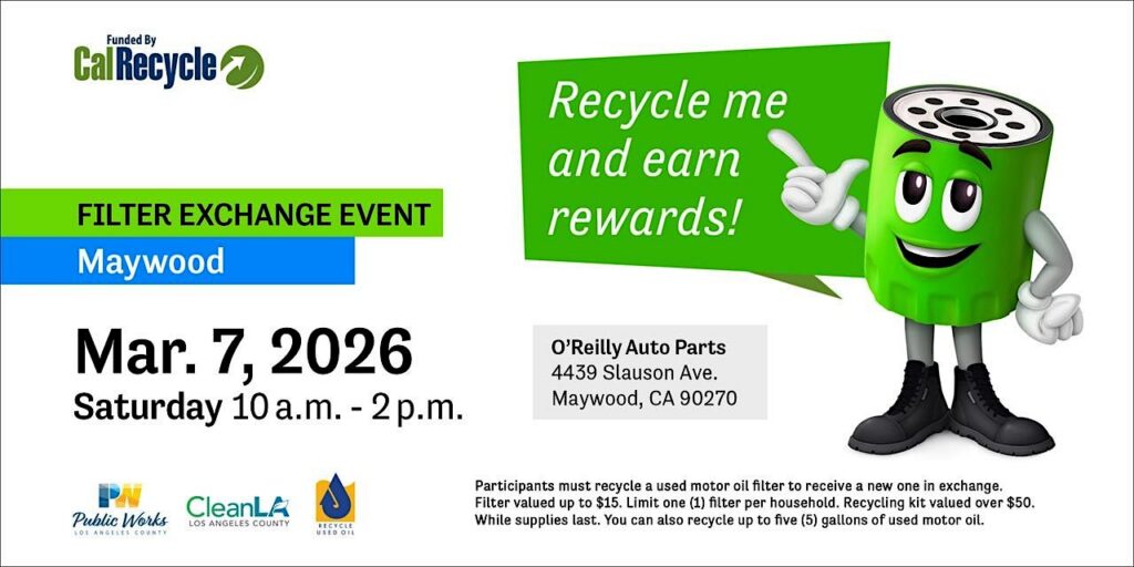 Recycle your used motor oil filter and receive a new one for free* at the event listed. Residents may also recycle their used motor oil free of charge at the event listed. Residents may also recycle their used motor oil free of charge (up to 5 gallons).