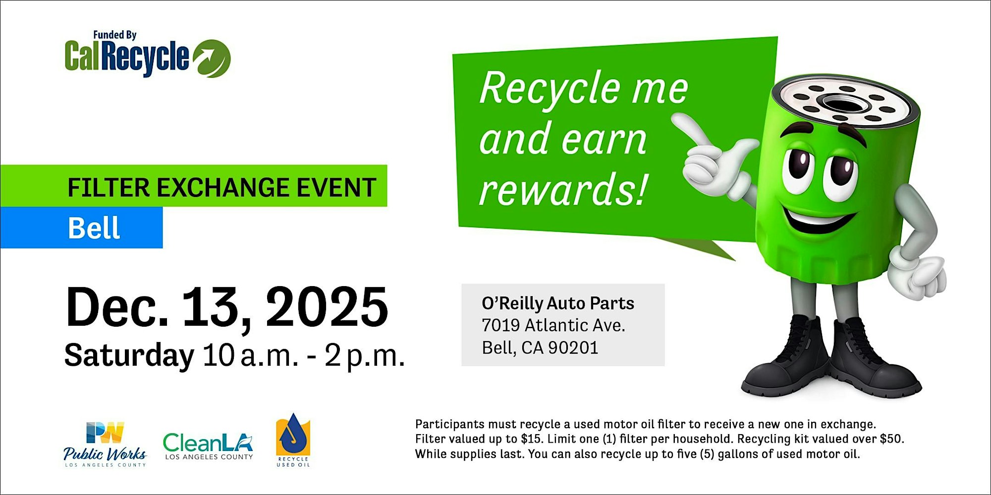 Dec 13 10:00 am - 2:00 pm Oil Filter Exchange Event O'Reilly Auto Parts - 7019 Atlantic Ave. Bell, CA 90201 7019 Atlantic Avenue, Bell Event Details Get Directions