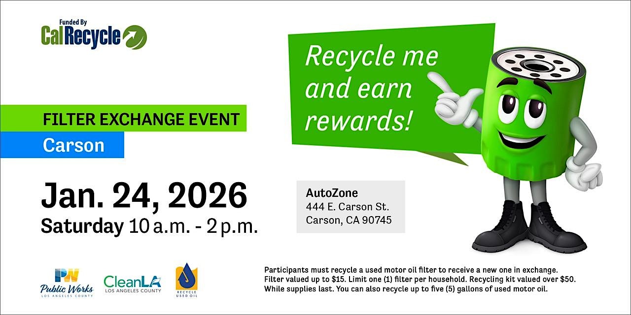 Jan 24 Filter Exchange Event 10:00 am - 2:00 pm AutoZone - 444 E. Carson St. Carson, CA 90745 444 E. Carson Street, Carson Event Details Get Directions