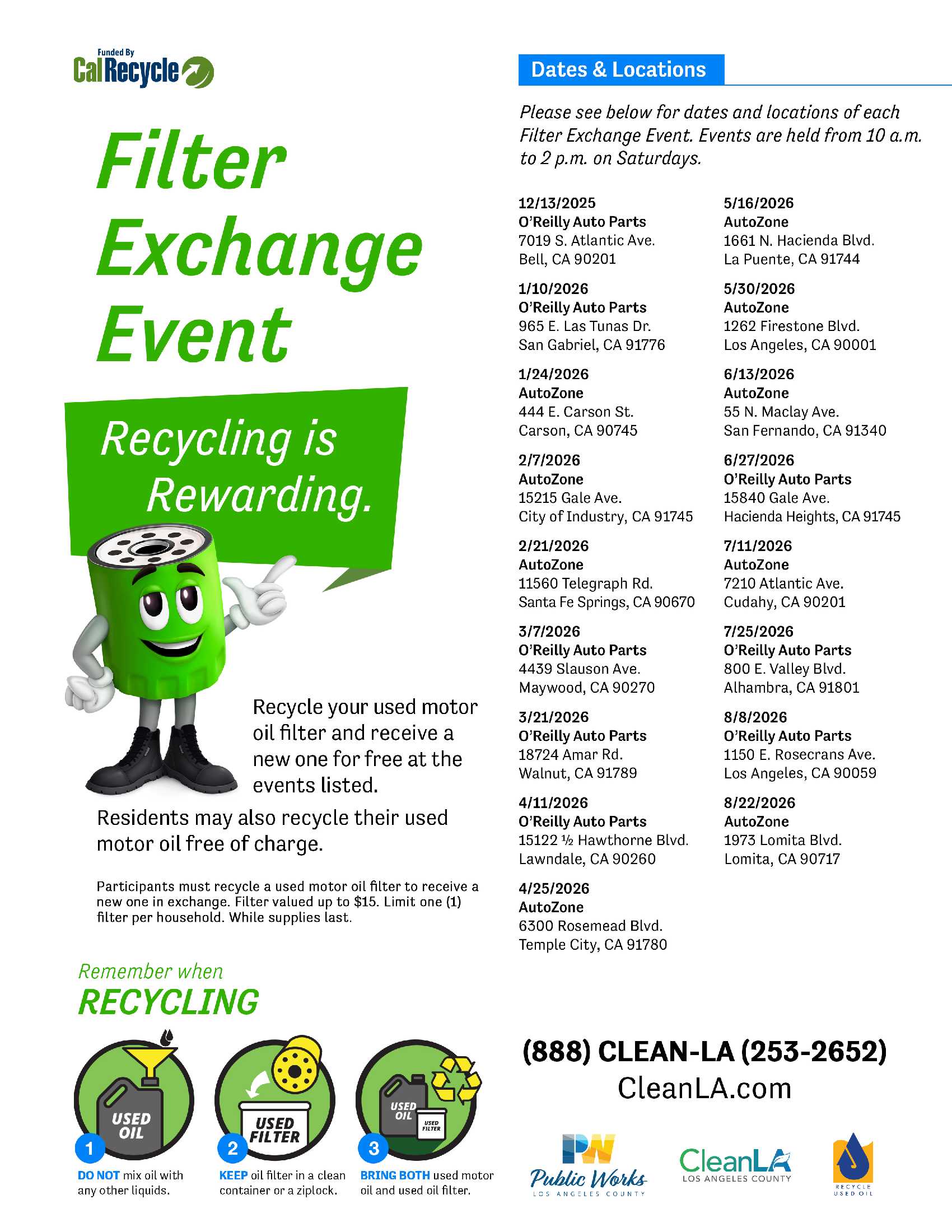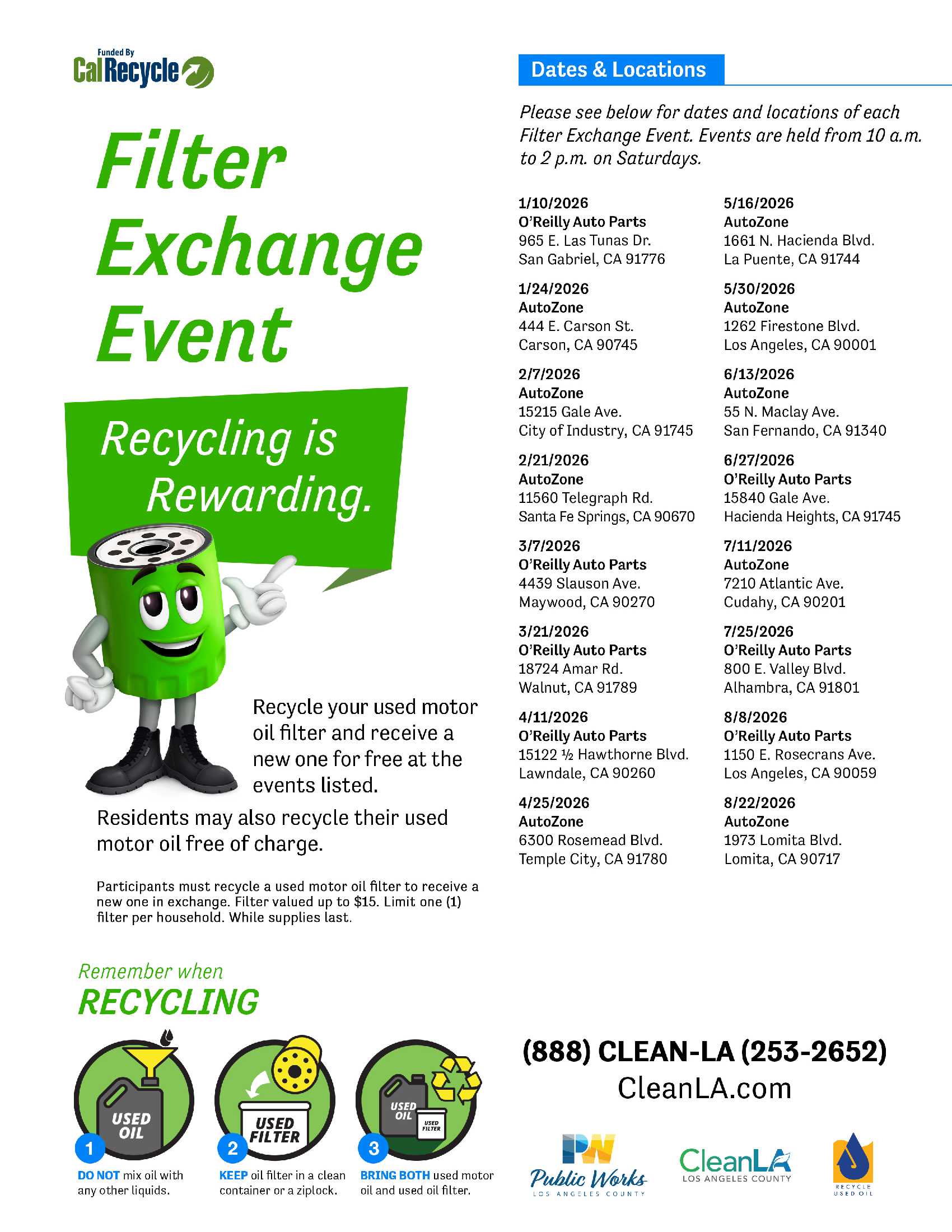 Recycle your used motor oil filter and receive a new one for FREE at the events listed. You can also recycle up to 5 gallons of used motor oil. Please see below for dates and locations of each Filter Exchange Event. Events are held on Saturdays from 10:00 a.m. to 2:00 p.m.